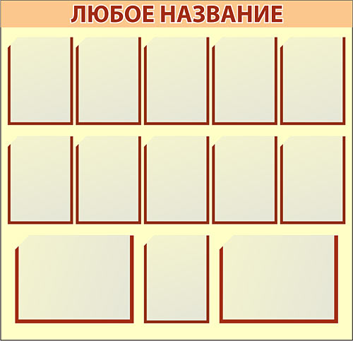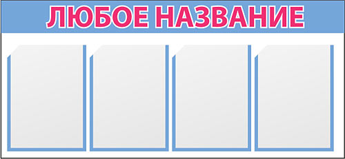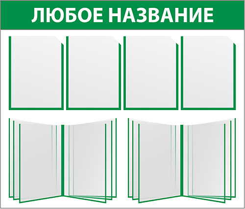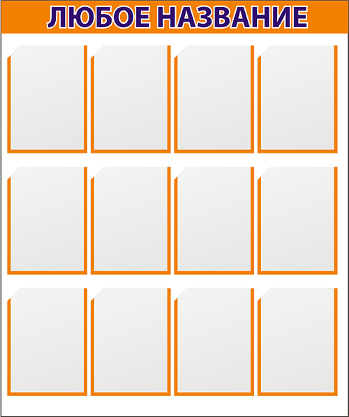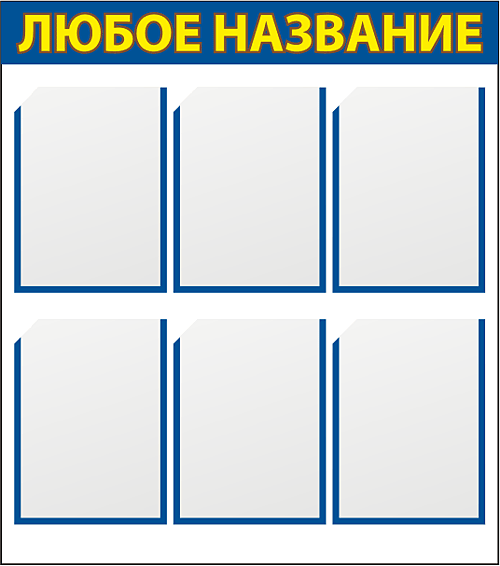 Стенды типовые изготавливаются из ПВХ 3мм, карманы - из прозрачного ПВХ (могут быть любого размера). Оформляются стенды аппликацией из самоклеящейся пленки ПВХ любого цвета либо методом широкоформатной печати. В названии стенда возможно размещение любых графических символов, в т.ч. Вашего торгового знака или логотипа.